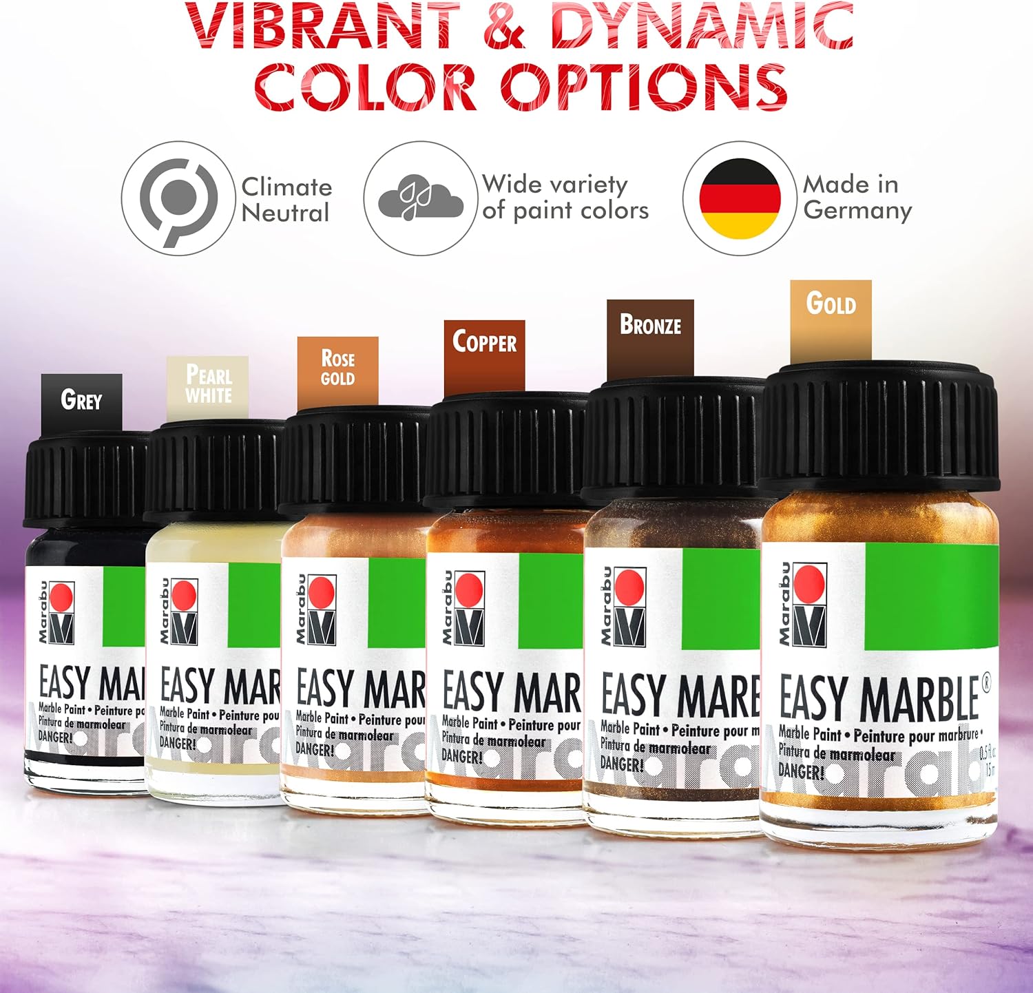 - 美麗的大理石效果- Marabu Easy 大理石顏料可在許多不同的基材上實現美麗的大理石效果,可粘附在紙張、玻璃、塑料、陶瓷、金屬、蠟、木材、聚酯、聚丙烯、帆布、光滑泡沫和許多其他表面上。